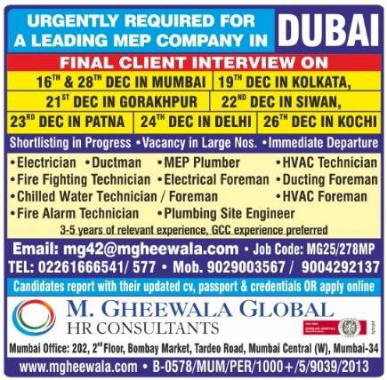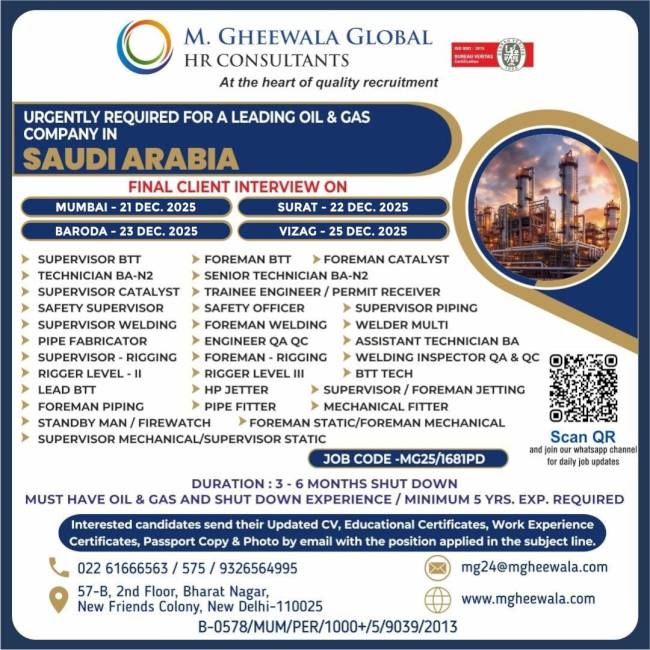 It was a very good experience with M. Gheewala Global during the recruitment process. The arrangements for interviews were great; candidates had good experience and were Gulf returnees, The coordinating staff were respecting us and were supporting our team to get skilled technicians in all trades.